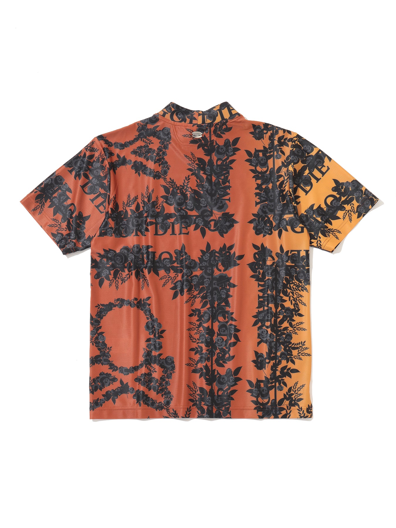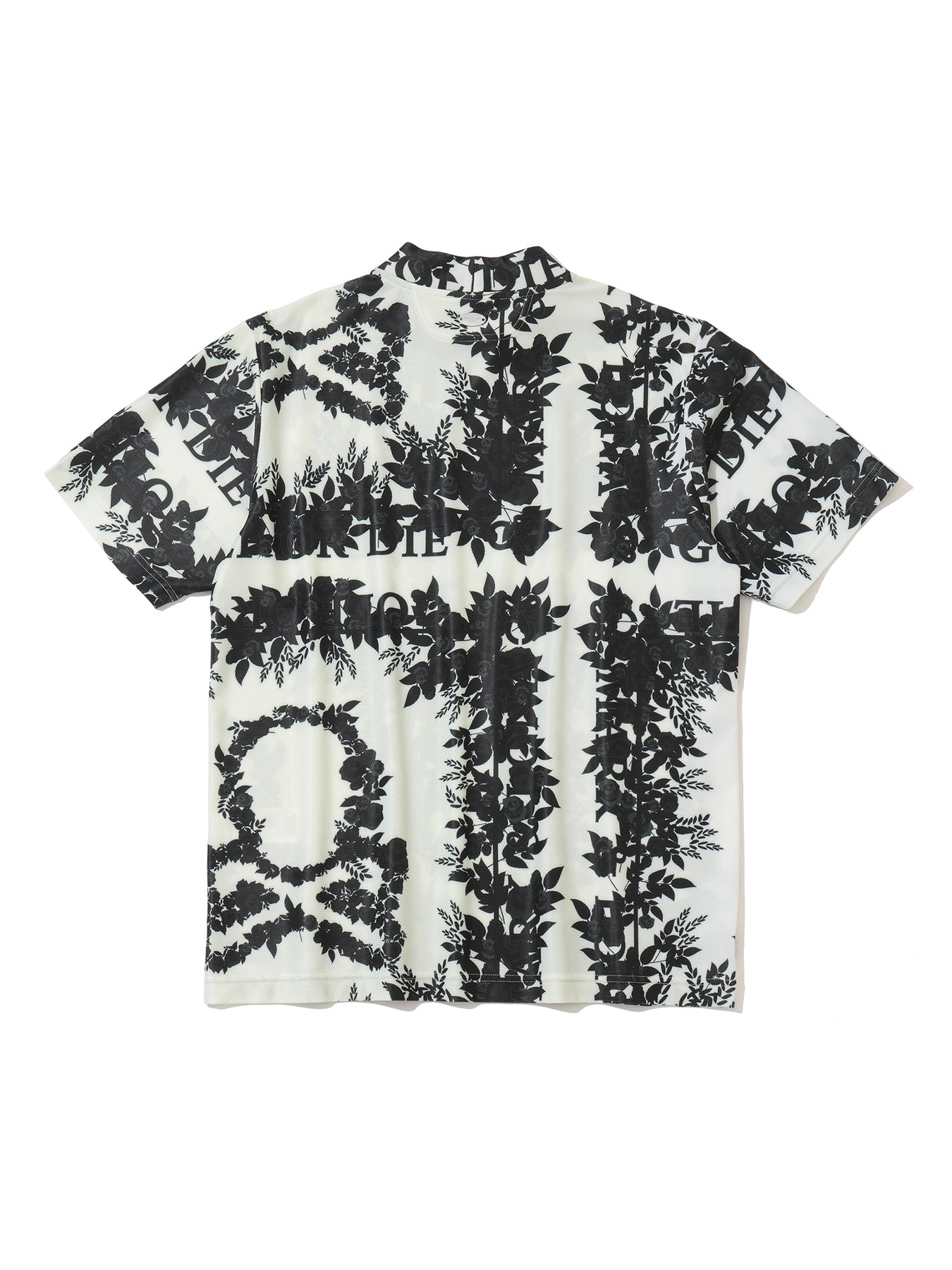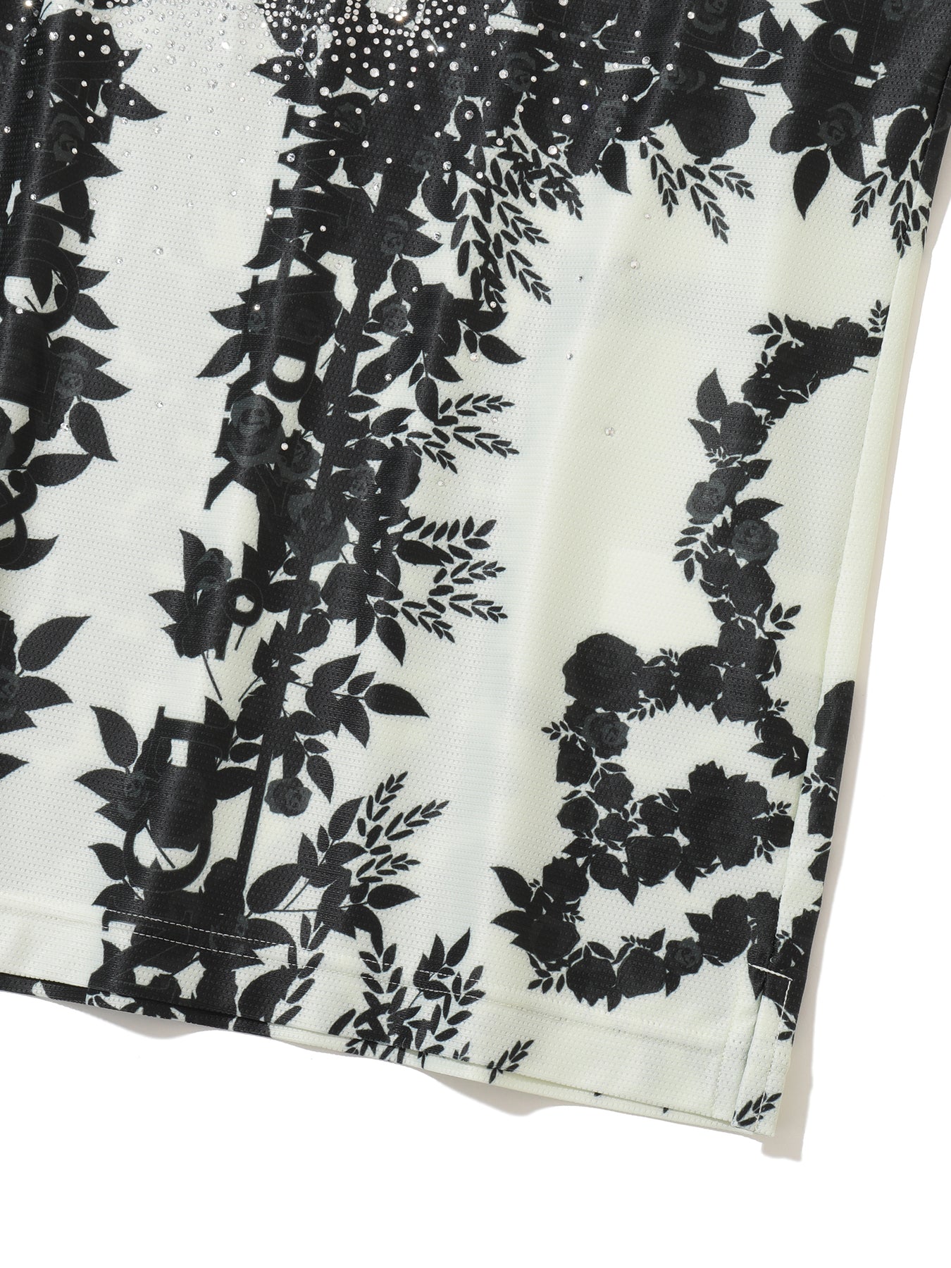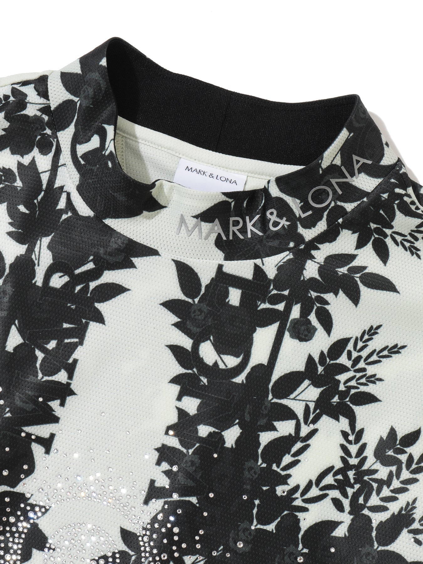・로즈와 스컬 패턴이 돋보이는 스와로브스키 스컬 모크넥 티셔츠